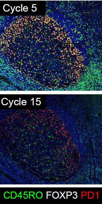 Tonsil tissue stained with CD45RO (green), FOXP3 (white), and PD1 (red).