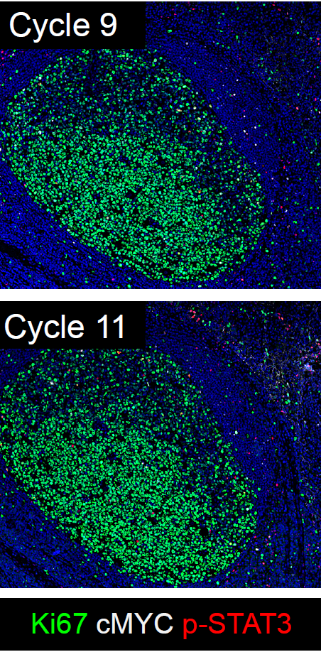 Tonsil tissue stained with Ki67 (green), cMYC (white), and pStat3 (red).