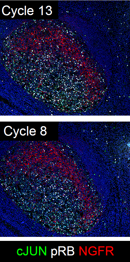 Tonsil tissue stained with cJUN (green), pRb (white), and NGFR (red).
