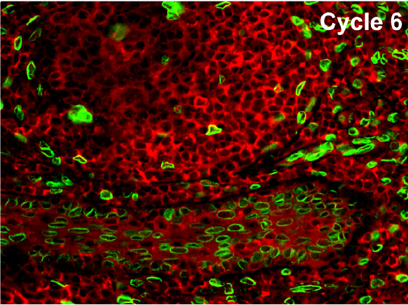 Human tonsil stained with NF-?B (red) and Lamin A/C (green).